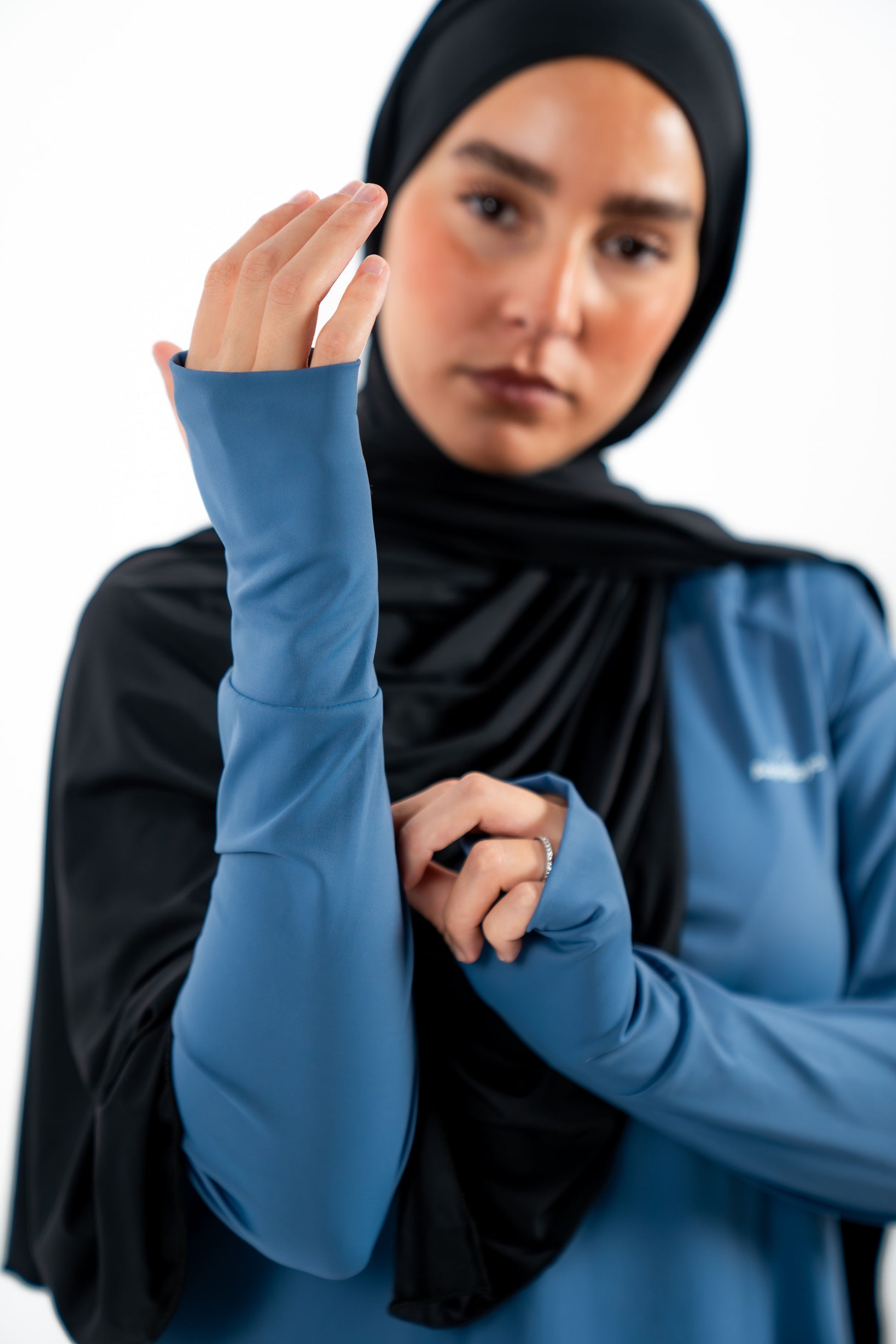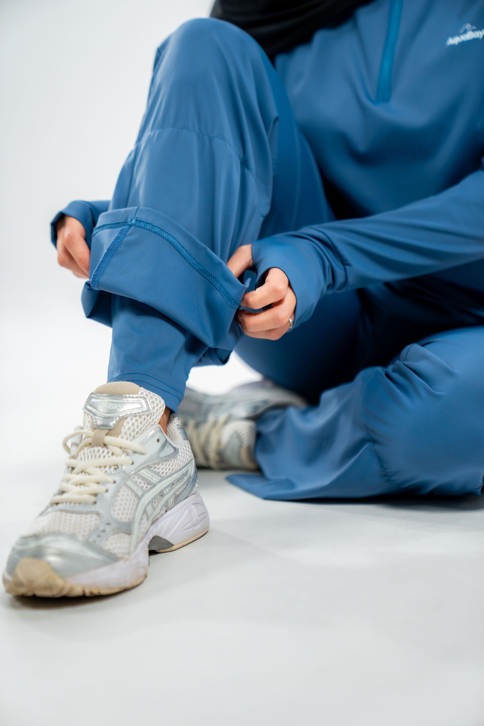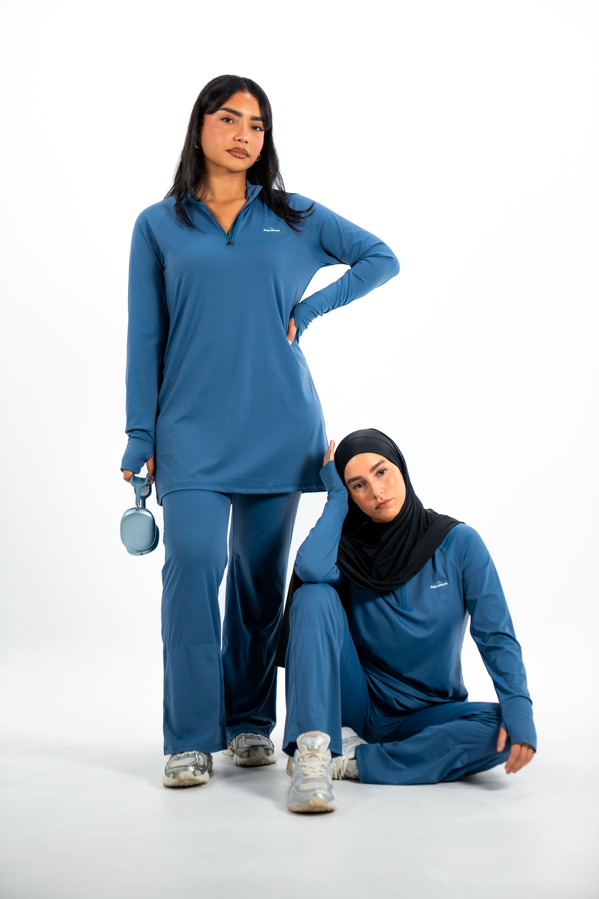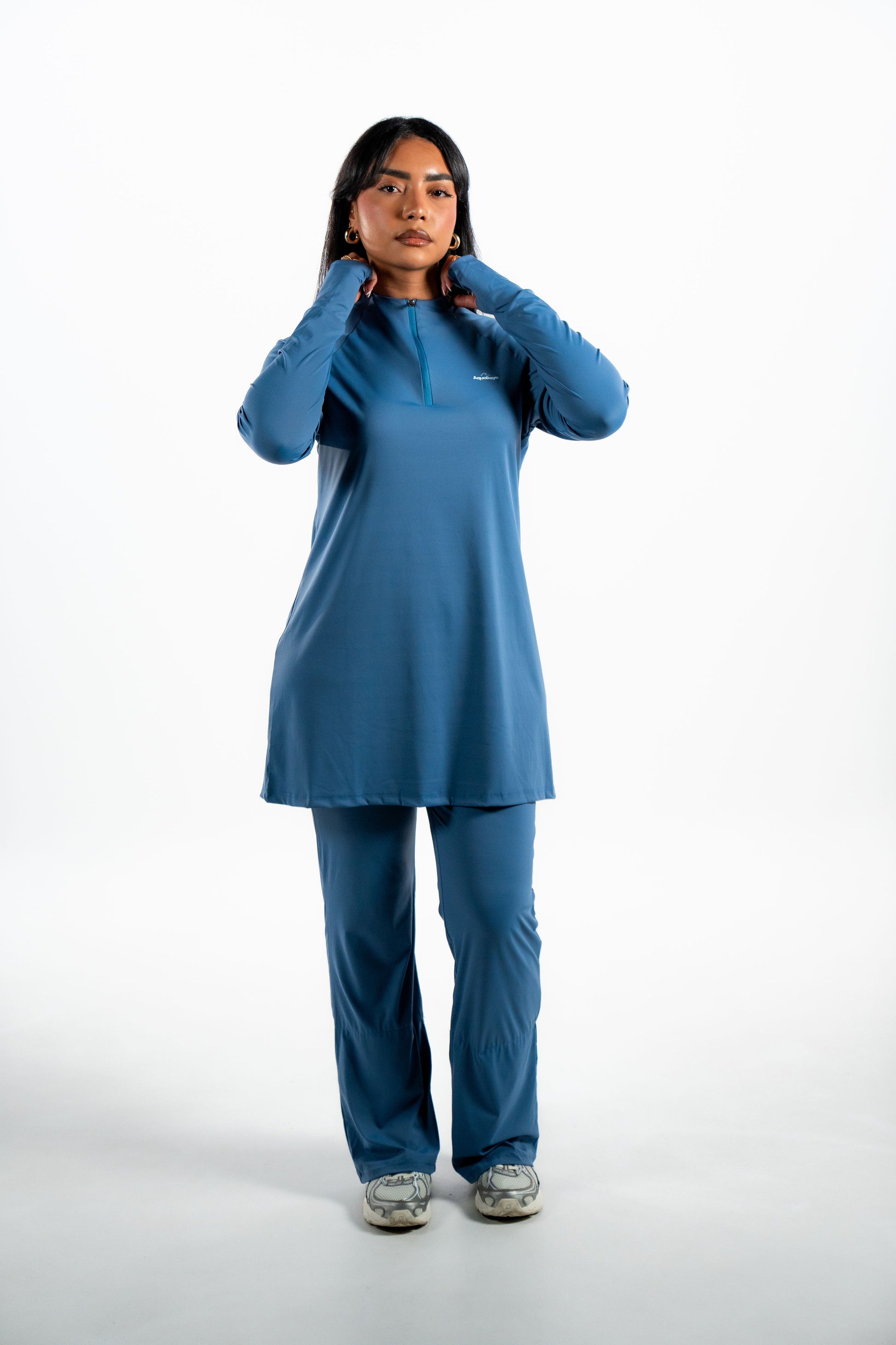 - Ensemble deux pièces : haut à manches longues avec ouverture au niveau du pouce et pantalon évasé avec legging intégré aux chevilles pour une couvrance maximale